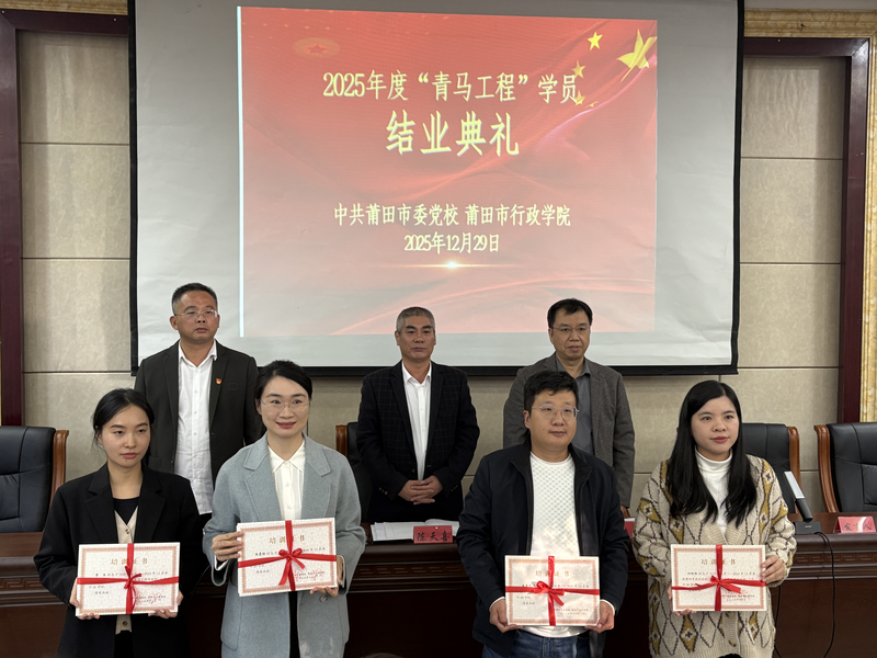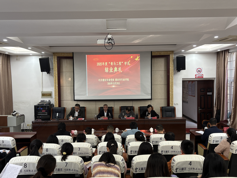 2025年12月29日下午,中共莆田市委党校(市行政学院)举行2025年度“青年马克思主义者培养工程”(以下简称“青马工程”)学员结业典礼。市委党校(市行政学院)副校(院)长、机关党委书记陈天喜,副校(院)长张大湖出席典礼。各县(区)委党校副校长及全市校(院)系统“青马工程”全体学员参加活动。